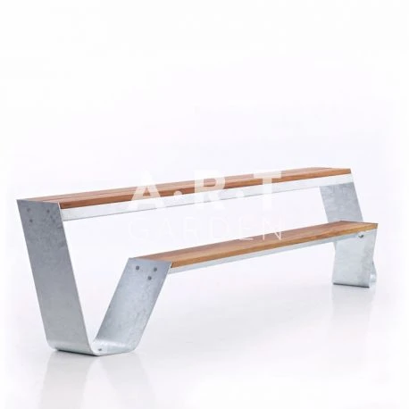 Les matériaux utilisés sont du bois dur FSC (iroko), de l’acier galvanisé pour le cadre et les pieds.