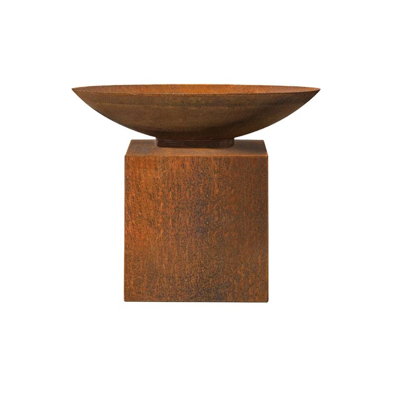 Bol de feu Scale de diamètre de 80 cm et son socle de 40 cm. Ce brasero ou cheminée d’extérieur est en acier corten. Idéal pour des soirées cosy !
