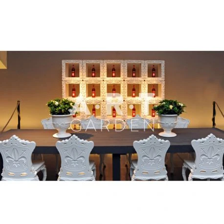 Parfaite pour décorer des espaces modernes aussi bien intérieurs qu’extérieurs, la chaise Princess of love possède la fameuse « fleur de Lys », présente à l’arrière du dossier et en haut de la chaise, véritable signature des 2 designers.