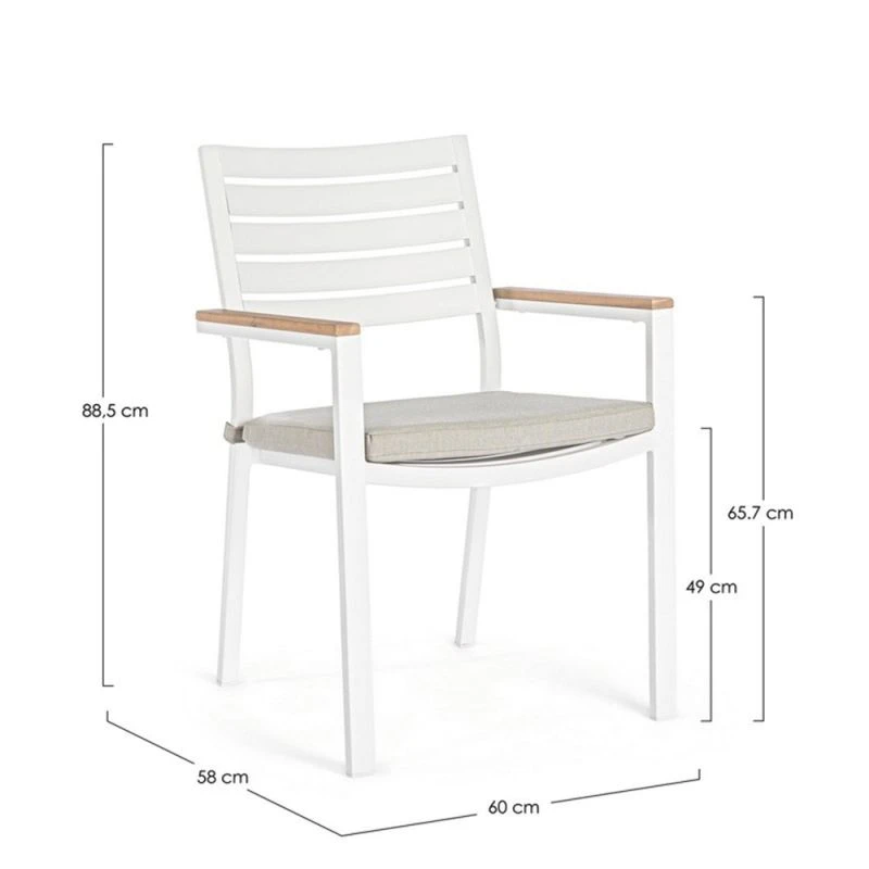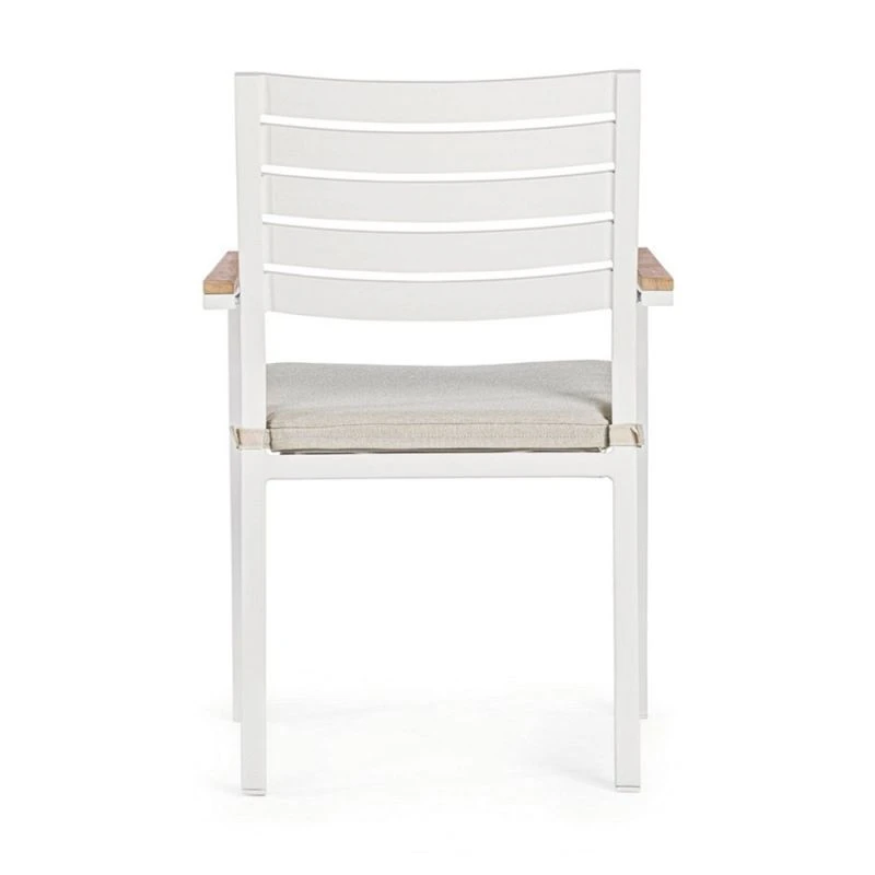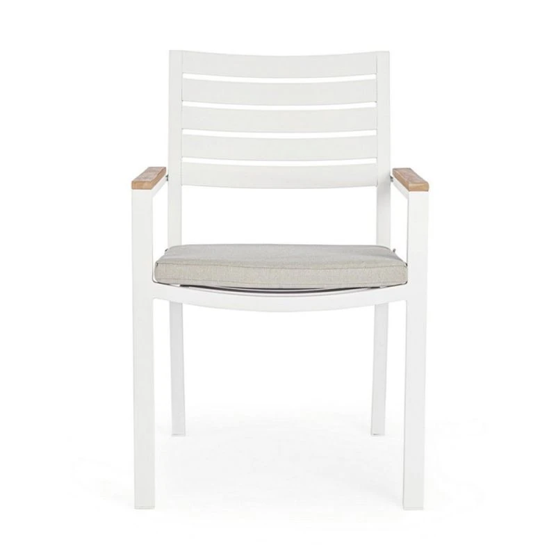 Chaise de jardin avec accoudoirs, le fauteuil Belmar sera l’allié idéal de vos repas de plein air. En aluminium blanc avec inserts peints bois naturel et coussin d’assise beige.