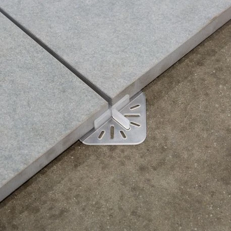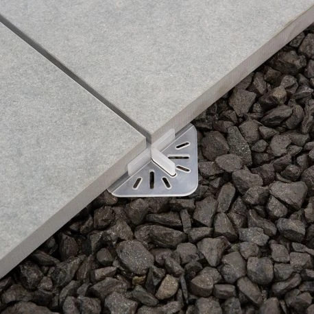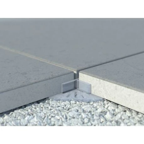 Le croisillon est muni de 4 languettes qui permettent de caler et stabiliser les dalles sans aucune fixation. Ils réalisent pour vous, un espacement uniforme entre les dalles de 3 mm. Les joints entre les dalles restent ouverts dans le but de favoriser l’évacuation des eaux mais peut-être compatible avec la pose de joint.