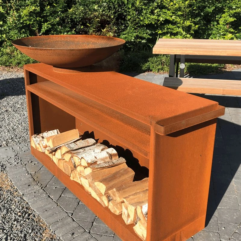 Plancha avec son support de travail 2 en 1 qui vous permet de cuisiner et de stocker votre bois ! En acier corten et brasero au choix, de 80 ou 100 cm de diamètre.