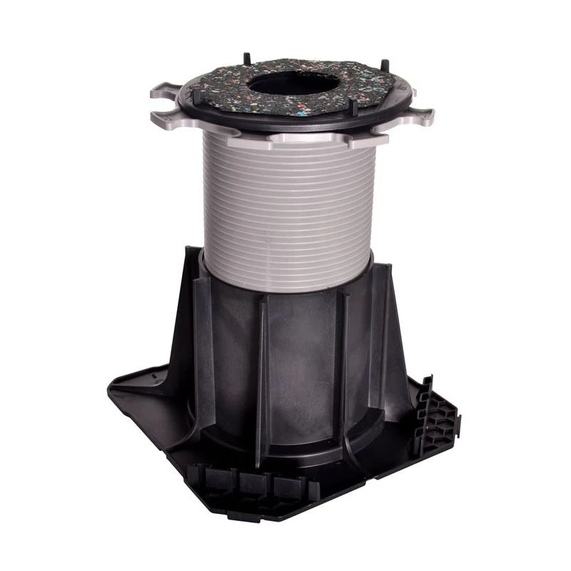 - Un double système de réglage de la hauteur. Soit manuellement grâce à l’écrou situé sous la tête du plot, soit grâce à un outil spécifique. Il s’agit d’une clé d’ajustement qui se glisse entre les dalles une fois le revêtement installé ;