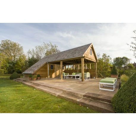 Profitez du beau temps et de votre piscine grâce à cette poolhouse en bois aux dimensions 1014 par 519 centimètres.
