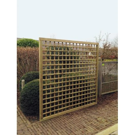 Le treillis Auvergne est la version avec cadre du treillis Provence. Il peut servir de façon traditionnelle comme support de plantes grimpantes adossé à un mur ou assemblé avec une jardnière mais il a l’avantage de pouvoir être également utilisé seul comme brise vue ou brise vent grâce à son cadre de section 44 x 55 mm. Il a reçu le traitement Collstrop à saturation en autoclave qui lui confère une tenue et résistance hors du commun et qui ne demande aucun entretien. Possédant des mailles de 7 cm, ses lamelles sont rabotées et chanfreinées de 13x27mm et maintenues entre elles par des agrafes en inox.